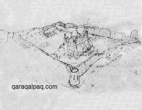 Illustration of Teshik qala from Sergey Tolstov's "Ancient Khorezm", 1948.