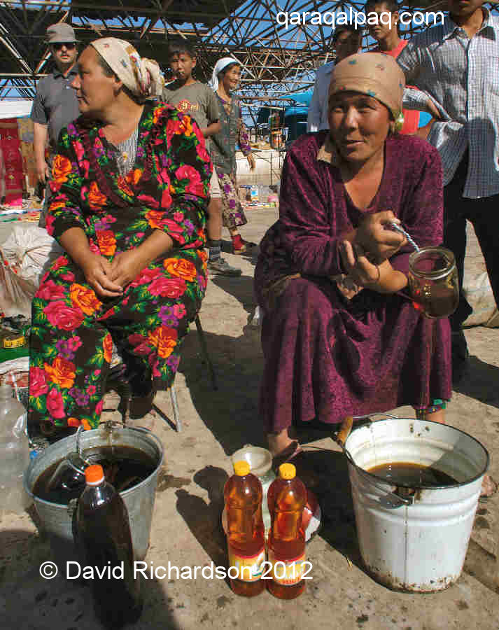 Selling cooking oil on Taxta Ko'pir bazaar. Many Qaraqalpaq women like to make dresses