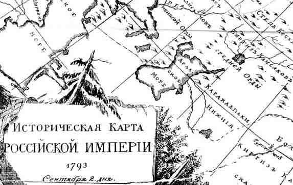 A map of the Russian Empire dated 1793 showing Lower Qaraqalpaqs living on the north-east shores of the Aral Sea.