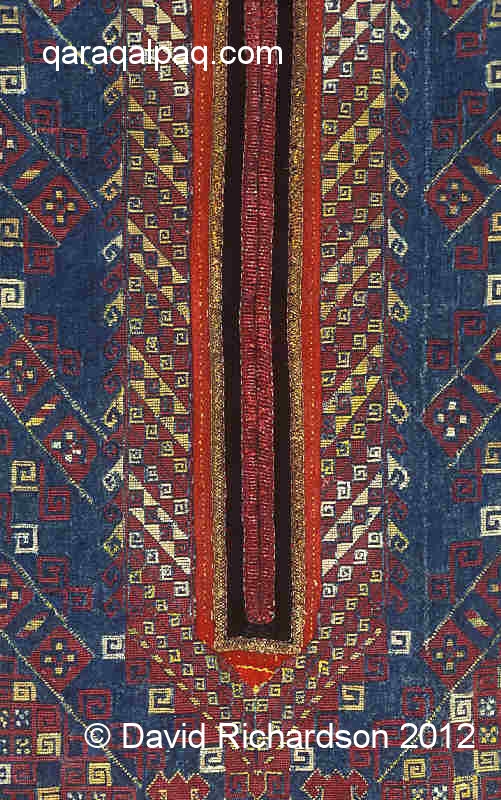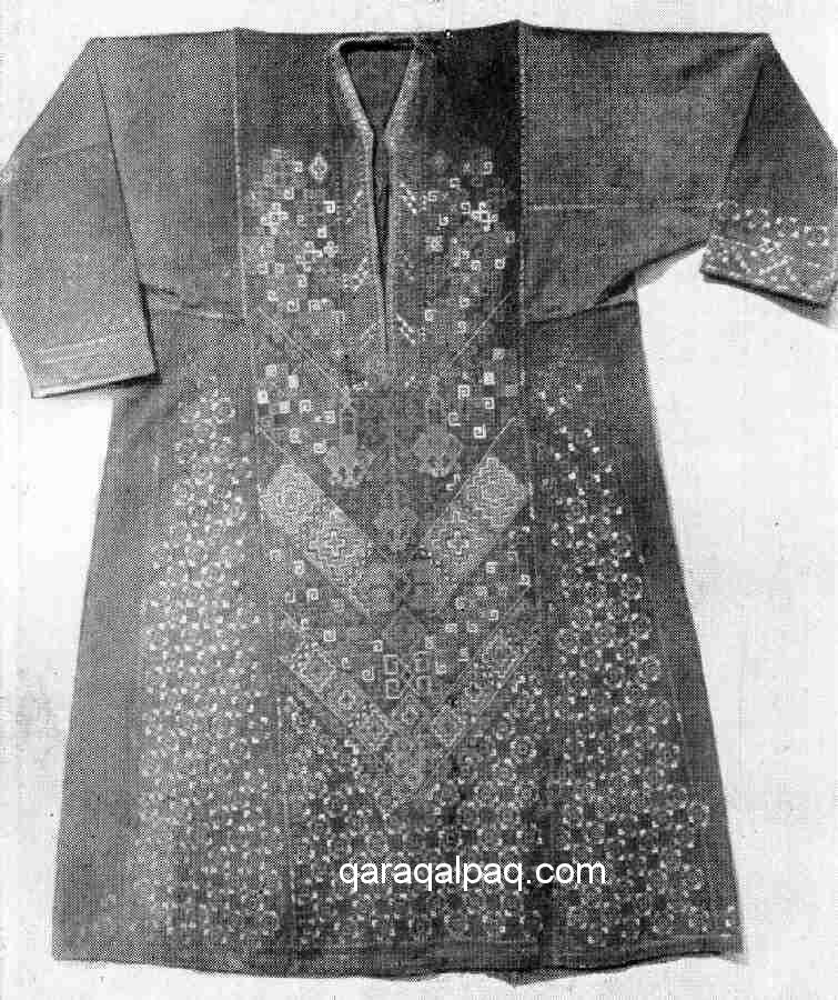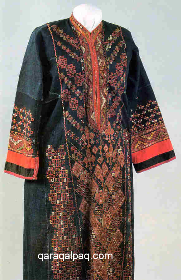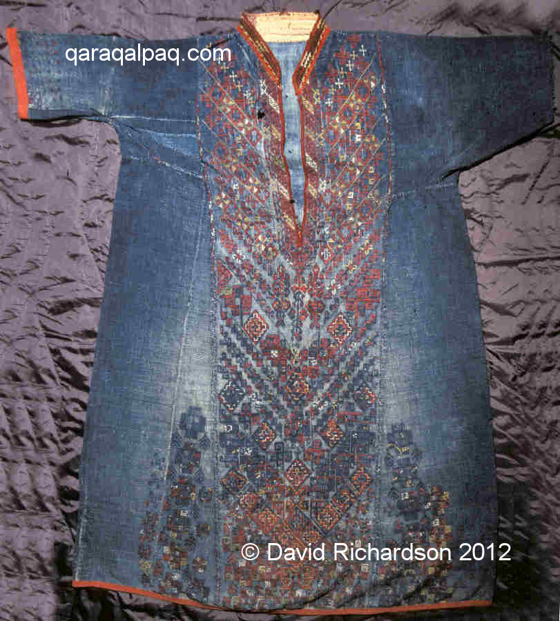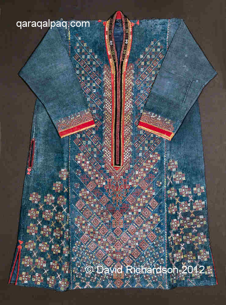 ContentsThe Ko'k Ko'ylekUsage Terminology Folk Beliefs Museum Collections History Links with the Volga and the Ob Pronunciation of Qaraqalpaq Terms References The Ko'k Ko'ylekThe Qaraqalpaq ko'k ko'ylek was an ankle-length, long-sleeved, unlined woman's tunic-style dress. The entire front of the dress was intensively decorated with geometric cross-stitch embroidery, as was the bottom part of the sleeves. The back remained undecorated.The dress was hand-tailored from narrow strips of indigo-dyed homewoven cotton bo'z, called by the Uzbeks matar. These were sewn together side by side to make the body of the dress and the sleeves. The body had a single central front panel and no shoulder seams. The collar was round and had a narrow and deep vertical opening at the front, a style normally reserved for women of childbearing age to facilitate breast-feeding. There were lower side vents for ease of movement and sometimes a pocket. In some cases the edges of the collar, lower hem, side vents, and cuffs were finished with a narrow strip of red textile.