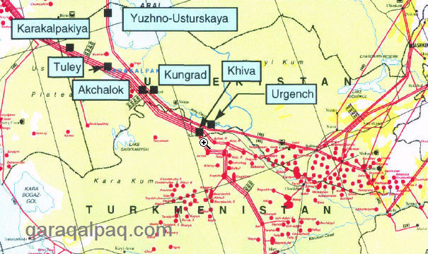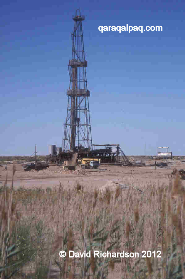 Map courtesy of the State Committee of Geology and Mineral Resources.(Click here to download a higher resolution version of this map.)The relative absence of such deposits in Qaraqalpaqstan stands out in comparison with the mineral wealth of the other provinces of Uzbekistan. Sadly for Qaraqalpaqstan the majority of its raw material deposits are fairly localized and small by international or even by Central Asian standards. Because of their remote location these raw material deposits do not generally justify the large capital investments required for their commercial exploitation. To date the two notable exceptions to this have been natural gas and rock salt. The discovery of major Qaraqalpaq gas fields on the central Ustyurt plateau and under the bed of the Aral Sea during the 1990s has led to the Uzbek government upgrading this region to become the number one national priority for future investment in gas field development and production. Qaraqalpaq natural gas is located closer to Russia’s industrial heartland and can be conveniently fed into the nearby Central Asia-Centre gas transmission lines that already cross the Ustyurt. In the last few years the Russians have taken a leading position as investment partners in the development of the Qaraqalpaq gas industry. The fortuitous occurrence of large salt deposits close to the limestone cliffs of the Ustyurt plateau has encouraged the Tashkent government to locate a new soda ash chemical processing plant close to Qon'ırat. Once fully on-stream this plant is anticipated to supply Uzbekistan’s total needs for soda ash, an important raw material for the manufacture of glass, detergents, and other industrial products. The plant will also produce salt and sodium hydroxide. Unfortunately for Qaraqalpaqstan the revenue raised by the sale and export of these natural resources and their derivatives is likely to end up in government coffers in Tashkent to be invested in the development of industries and infrastructure in more developed regions like Tashkent itself, or Samarkand and Ferghana. Oil and Natural GasExisting and Potential ReservesIt is possible that Qaraqalpaqstan has some of the largest reserves of hydrocarbons in Uzbekistan. By 2004 some 20 gas fields had been discovered in the Qaraqalpaq portion of the Ustyurt plateau. Significant reserves have also been located under the bed of the rapidly disappearing Aral Sea. The majority of these deposits have only been discovered during the last decade. As elsewhere in Uzbekistan most of the finds are in the form of natural gas rather than oil. Energy analysts estimate potential Qaraqalpaq reserves of gas at 1.7 trillion cubic metres and potential reserves of oil at 1.7 billion tonnes.The importance of these potential new finds can be judged from the fact that in 2004 the total of all of Uzbekistan’s proven existing natural gas reserves were reported to be 1.86 trillion cubic metres. While small in comparison to Russia, which has the world’s largest proven reserves (48 trillion cubic metres), Uzbekistan’s resources are still important and are around twice those of Britain, Europe’s largest gas producer. Uzbekistan is ranked the eighteenth most important country in the world in terms of proven gas reserves. Although still somewhat speculative, total probable gas reserves are estimated at between 5 to 6.25 trillion cubic metres, of which 1.2 trillion are anticipated to derive from the Ustyurt and 0.5 trillion from the Aral Sea. At present proven reserves from both of these locations are negligible. Although Uzbekistan was a relative newcomer to the oil and gas industry it is already an important producer of natural gas, ranked within the top ten producing nations of the world. The majority of its currently operational gas fields lie in a region known to geologists as the Amu Darya Basin, a region of the Qizil Qum desert lying to the east of Qaraqalpaqstan, between Khiva and Bukhara, and extending south through Turkmenistan as far as the Kopet Dagh. The very first Uzbek gas field at Setalantepe was only discovered in this region in 1953. The first major find – the giant Gazli field located 110 km to the north-west of Bukhara - occurred in 1956. With original reserves of about 700 billion cubic metres, Gazli is the only major gas field in Uzbekistan to be free from sulphur and also has a very low content of nitrogen and carbon dioxide. Today there are over 80 natural gas fields in Uzbekistan with 12 major deposits, of which Gazli, Shurtan, and Kokdumalak in the Amu Darya Basin are the largest. The Gazli field, which can be seen from the road between No'kis and Bukhara, is currently still the biggest producer of natural gas. The second largest production is from Shurtan, to the east of Bukhara, which began producing in 1980 and accounted for 36% of Uzbekistan's natural gas production in 2000. About 80% of current Uzbek gas production comes from the Amu Darya Basin. The other two important regions are the Ferghana Valley and the Murabek area in the south-west of Uzbekistan. The oldest gas field in Qaraqalpaqstan is at Shaxpaxty on the Ustyurt plateau, in the south-west of the Autonomous Republic to the west of the Sarykamysh Lake. Operations at Shaxpaxty began in 1962 and its reserves at that time were estimated at 40 billion cubic metres. A feeder pipeline was constructed running north from Shaxpaxty to the Qaraqalpaqia compressor station linking it to the Central Asia-Centre pipeline. However production at Shaxpaxty was halted in February 2002 because of the obsolescent state of equipment at the compressor station, by which time some 8 billion cubic metres of the reserve had been extracted. In the early 1990s exploration work began at an accelerating pace across the dried-up bed of the Aral Sea in Qaraqalpaqstan, and on the nearby Ustyurt plateau. By 2001 test rigs could be seen dotted right across the former seabed lying to the north of Moynaq. The Qazaqs too began exploration work 