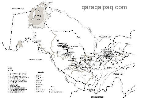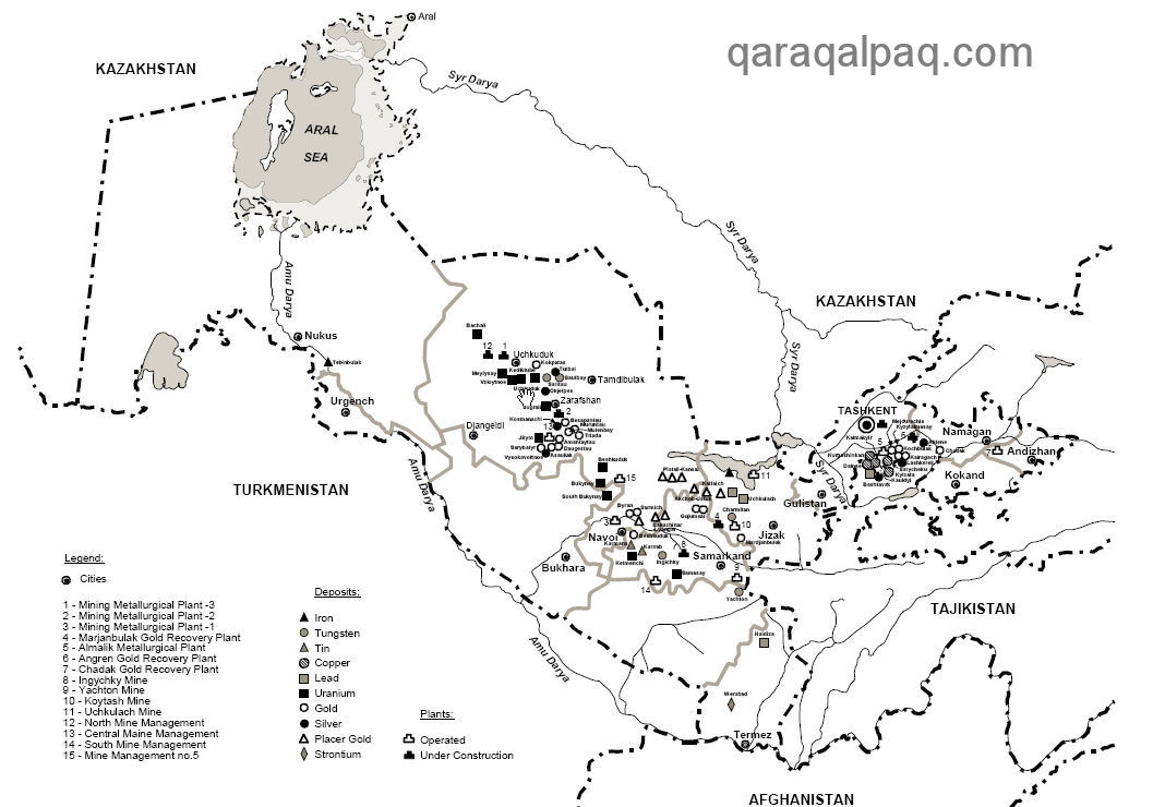 SummaryUnder the Soviets the natural resources of Uzbekistan, including Qaraqalpaqstan, were exploited to provide cheap raw and semi-finished materials to power and supply the Russian military-industrial complex. Since independence the focus of the new regime has been to accelerate the exploitation of Uzbekistan’s natural resources for its own benefit, by developing and expanding local processing and manufacturing industries, especially those with either import substitution or export and foreign currency earning potential. In the first few years of independence it was naively thought that foreign investment would quickly flow into Uzbekistan from the West to fund new ventures aimed at exploiting the countries vast natural reserves. Although there have been a few success stories with private Western companies – most notably in the Uzbek gold extraction industry – many potential investors have been discouraged by corruption, currency, and other bureaucratic restrictions, and concerns about the regime’s stability. In recent years Uzbekistan has introduced production- sharing agreements as a means of encouraging investment in mines and gas wells and has increasingly turned back towards the former eastern Communist bloc, forming strategic partnerships with companies from both Russia and China. Some indication of the relative position of Qaraqalpaqstan compared to the rest of Uzbekistan can be gauged from the following map, drafted by the Uzbek State Committee of Geology and Mineral Resources, which shows the country’s major deposits of mineral resources: