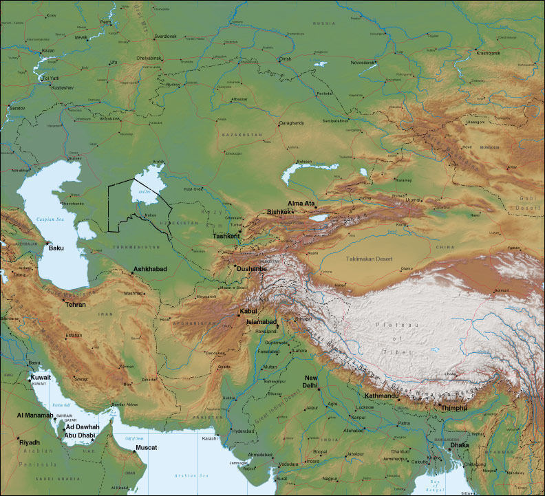Qum, reaching close to Tashkent, while to the west lies the huge elevated Ustyurt Plateau, separating the Aral from the much deeper Caspian basin and