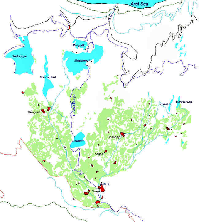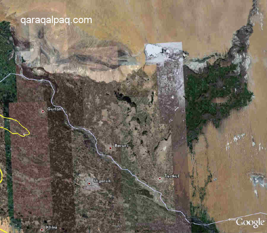 The image also shows how the inhabited part of Qaraqalpaqstan is divided into three almost separate regions by the artificial border - the northern