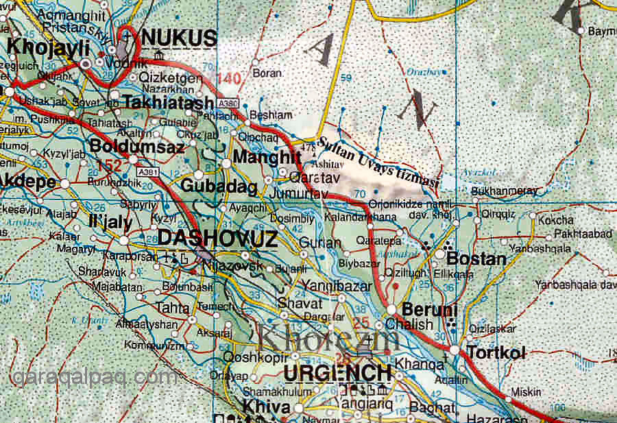 The A380 running from Miskin to No'kis via Biruniy in southern Qaraqalpaqstan.